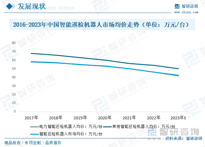 随同传感器技艺、智能操纵技艺、数据发现技艺以及人为智能技艺等学科常识和技艺的积蓄和行使,智能巡航机械人与各式新技艺的连接愈加精密,发生轶群种新的功效与行使。与此同时,科学技艺的发展带来干系产物墟市价钱不休下降。2022年中国智能巡检机械人墟市均价为46.3万元/台,电力智能巡检机械人均价46万元/台,其他智能巡检机械人均价54万元/台;2023年中国智能巡检机械人墟市均价约为42.5万元/台,电力智能巡检机械人均价约为42万元/台,其他智能巡检机械人均价约为50万元/台。