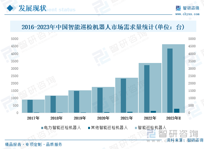 杏彩体育官网登录跟着盘算推算机视觉和机械练习等技艺的成长,巡检机械人的机能和功效也取得了不休抬高,巡检机械人的行使越来越普通,墟市需求也正在不休延长。2016年中国智能巡检机械人需求量602台,估计2023年中国巡检机械人需求总量为4637台。此中:电力智能巡检机械人4350台,其他智能巡检机械人287台。
